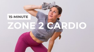 15 Minute Zone 2 Cardio with Weights is 18:21 minutes; 1:50 minute intro, 3:40 minute warm up and 1:10 minute stretch. Equipment: dumbbells. Lindsey is using one 20 pound dumbbell. I used one 15 pound dumbbell for everything except #9; I used a 20 pound dumbbell for that.