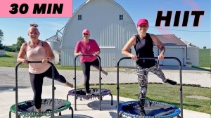 30 Minute Rebounder Workout HIIT to the Beat is 30:37 minutes; 33 second intro, 5 minute warm up and 5 minute cool down. There is no stretch. This workout uses a bar attached to the rebounder. The exercisers’ hands are on the bar for every move.