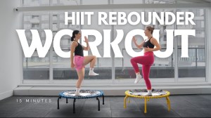 15-Min Rebounding HIIT Workout is 16:02 minutes. No warm up or cool down/stretch. However the first interval is one of the easier moves and serves to warm you up.