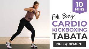 10 Minute Cardio Kickboxing Tabata Workout is 11:28 minutes; 50 second intro, no warm up or stretch. I wore 2 pounded weighted gloves.
