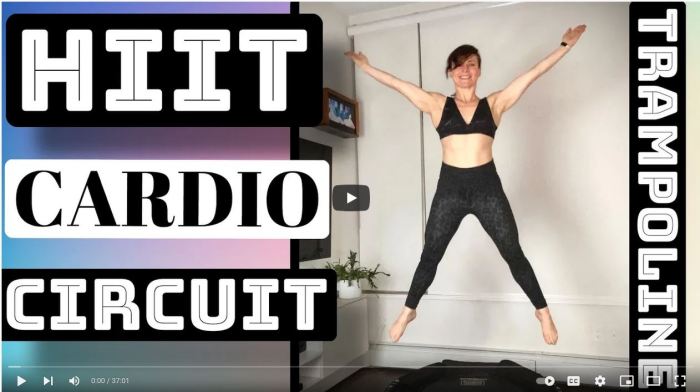 Fitness Trampoline Workout / Mini Trampoline Cardio / HIIT Circuit is another intense rebounder workout from Naomi Joy. This workout is done circuit fashion. You do 4 exercises then you repeat those 4 exercises before moving on to the next circuit. There are 5 circuits total (20 exercises). I got a great cardio workout. I … Continue reading Naomi Joy Fitness: Fitness Trampoline Workout / Mini Trampoline Cardio/ HIIT Circuit