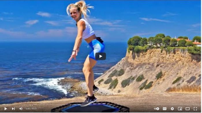 30 Min Cardio Rebounder Routine is an excellent rebounder cardio workout led by Gymra trainer Jen Brown. Jen is doing this workout outside with a large body of water behind her. It must be the Pacific because she says at one point that she is in LA. The structure of this workout is blocks of … Continue reading GymRa: 30 Min Cardio Rebounder Routine