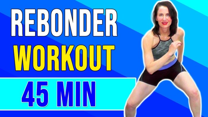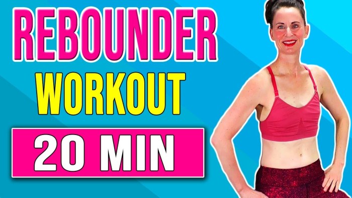 Another fun and effective rebounder workout from AngieFitnessTV. I really couldn't figure out the exact title to this workout but the title I used is close enough. The first part of this workout is rebounder cardio and the remainder of the workout is resistance training using a resistance tube. Each exercise is done for 1 … Continue reading AngieFitnessTV: 40 Minute Cardio + Strength Rebounder Workout