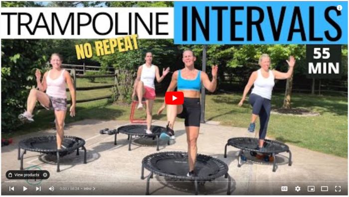 55 Min Trampoline Intervals Cardio & Strength | Rebounder + Dumbbells | HIIT Training | No Repeats is a cardio + strength workout from Michelle Briehler and it moves non-stop. It is done interval style so you are getting rests but it seems non-stop because Michelle doesn't rest. She almost immediately starts the next move. … Continue reading 55 MIN Trampoline Intervals Cardio & Strength | Rebounder + Dumbbells | HIIT Training | NO REPEAT 💦