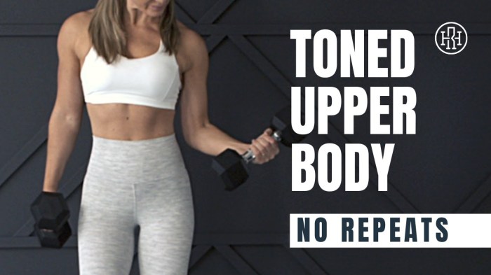 I love Heather Robertson's no repeat workouts. I do think repetition needs to happen when building strength but Heather's no repeat workouts are fun and refreshing while still working you well. They are a great way to mix up your training to keep things interesting. In her Upper Body Toning // No Repeats Workout she … Continue reading Upper Body Toning // No Repeats Workout